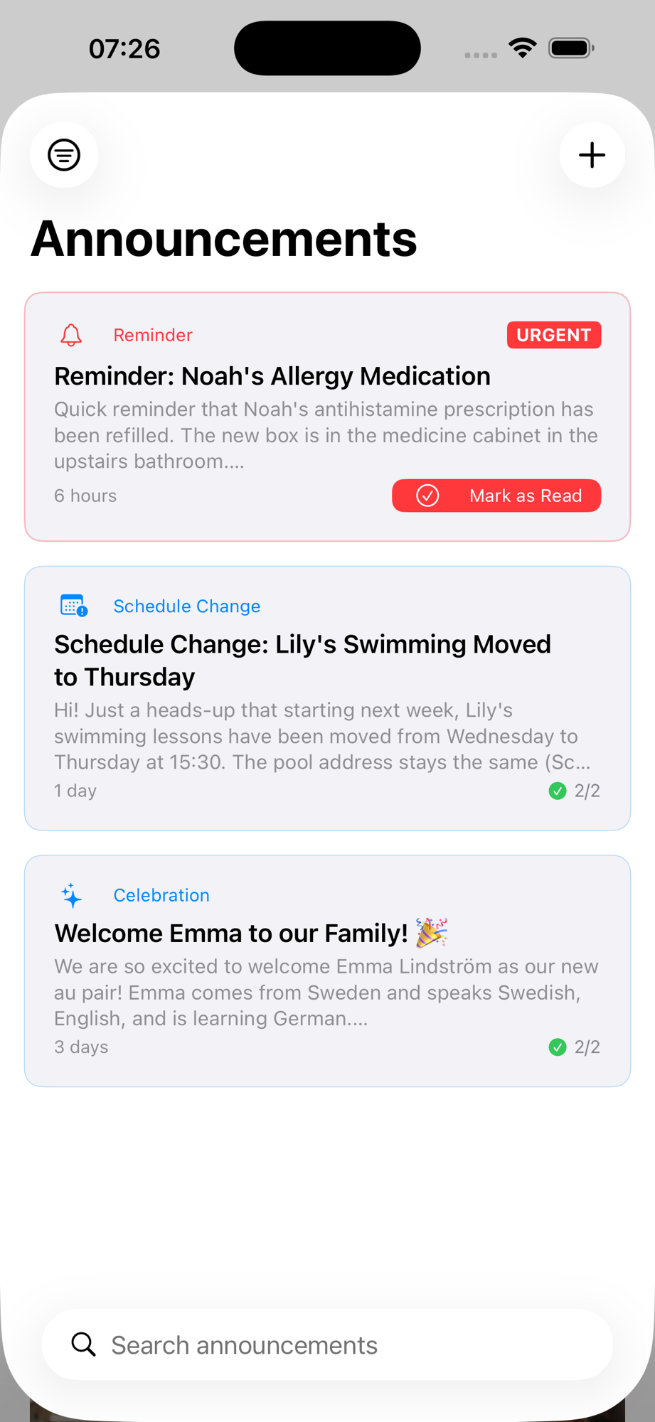 Du musst nachschauen, was du letzten Monat zu Noahs Medikament geschrieben hast? Nutze die Suchleiste in der Ankündigungsliste. Deshalb sind klare, konkrete Titel so wichtig — „Erinnerung: Noahs Allergiemedikament" lässt sich viel leichter finden als „Wichtiges Update".