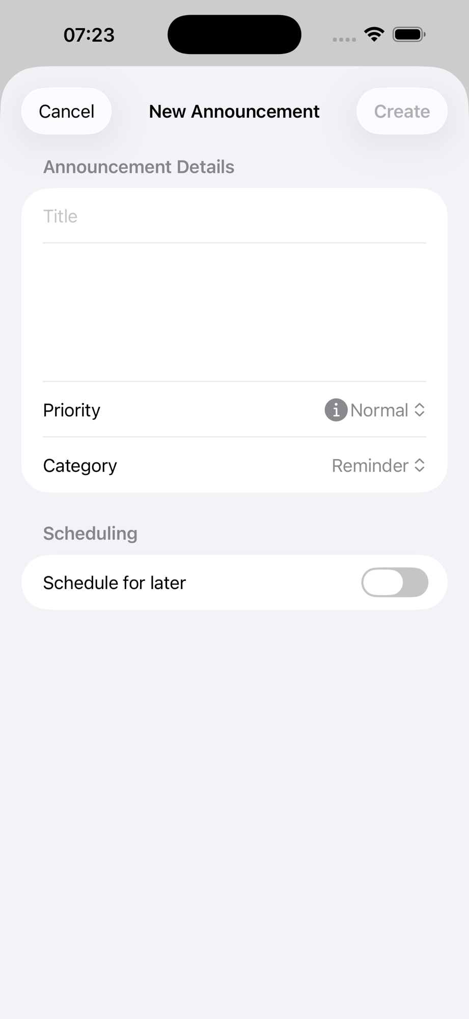 Nur Eltern können Ankündigungen erstellen. Tippe auf den +-Button oben rechts in der Ankündigungsliste (oder das +-Symbol neben der Überschrift auf dem Dashboard).