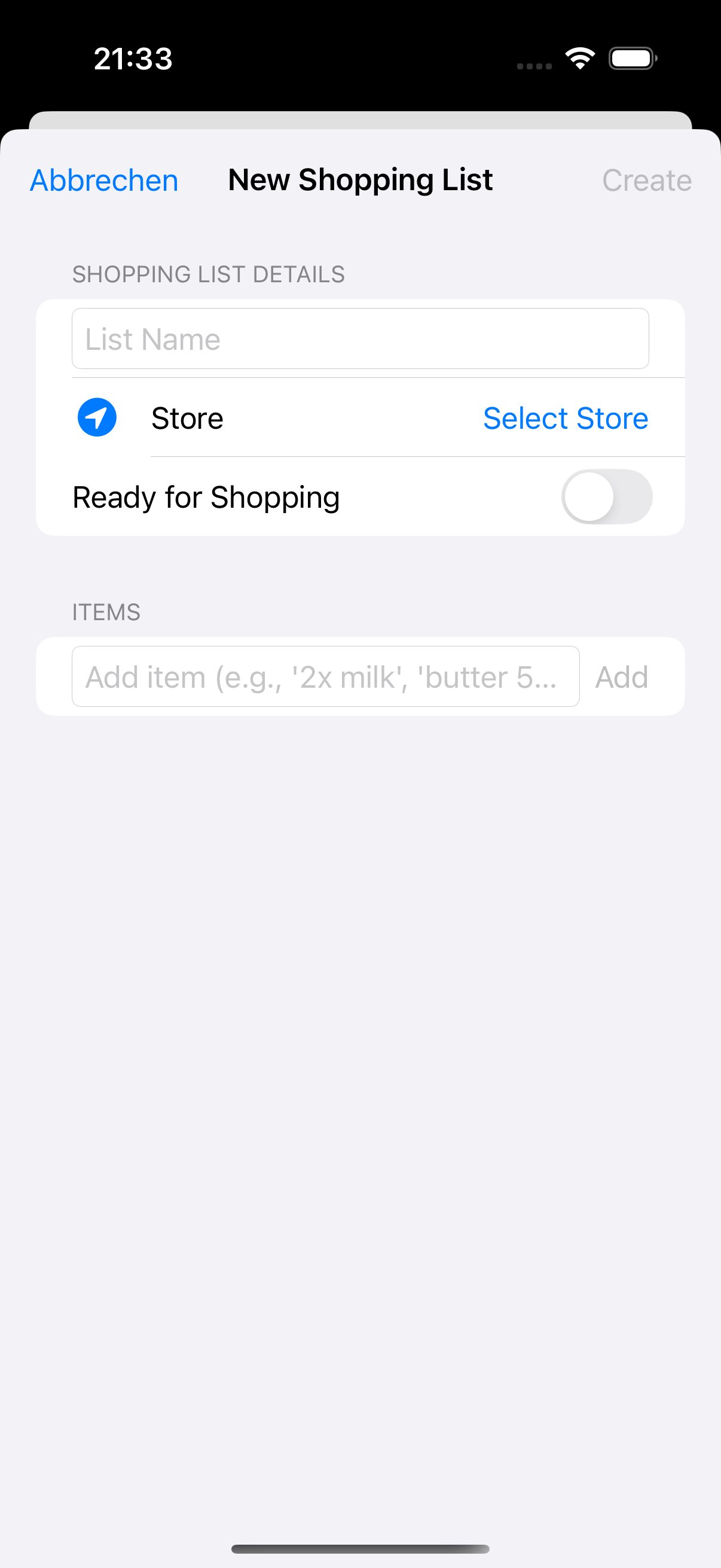 Tippe oben auf dem Bildschirm auf Neue Einkaufsliste erstellen. Ein Formular öffnet sich mit folgenden Feldern: