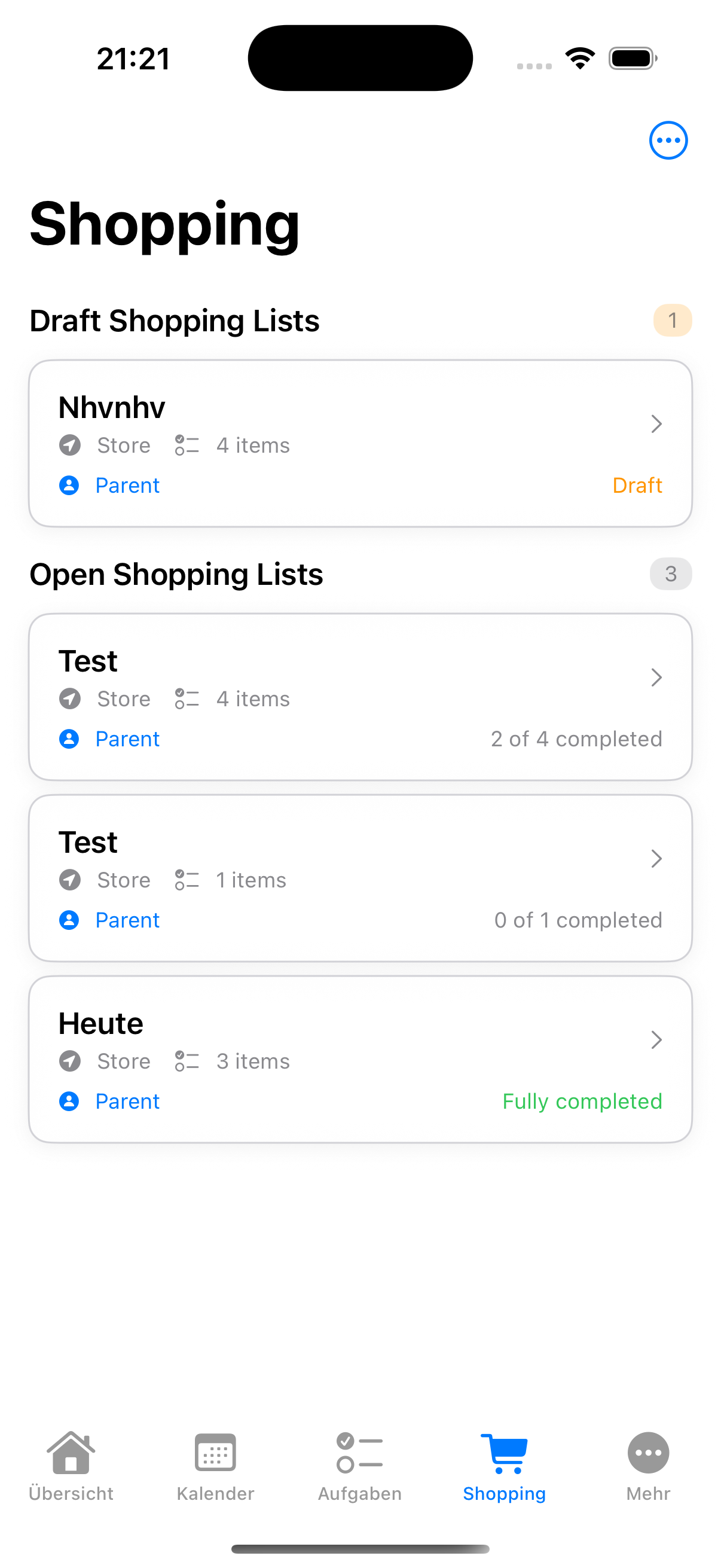 - Offene Einkaufslisten — Listen, die einkaufsbereit und mit der zugewiesenen Person geteilt sind